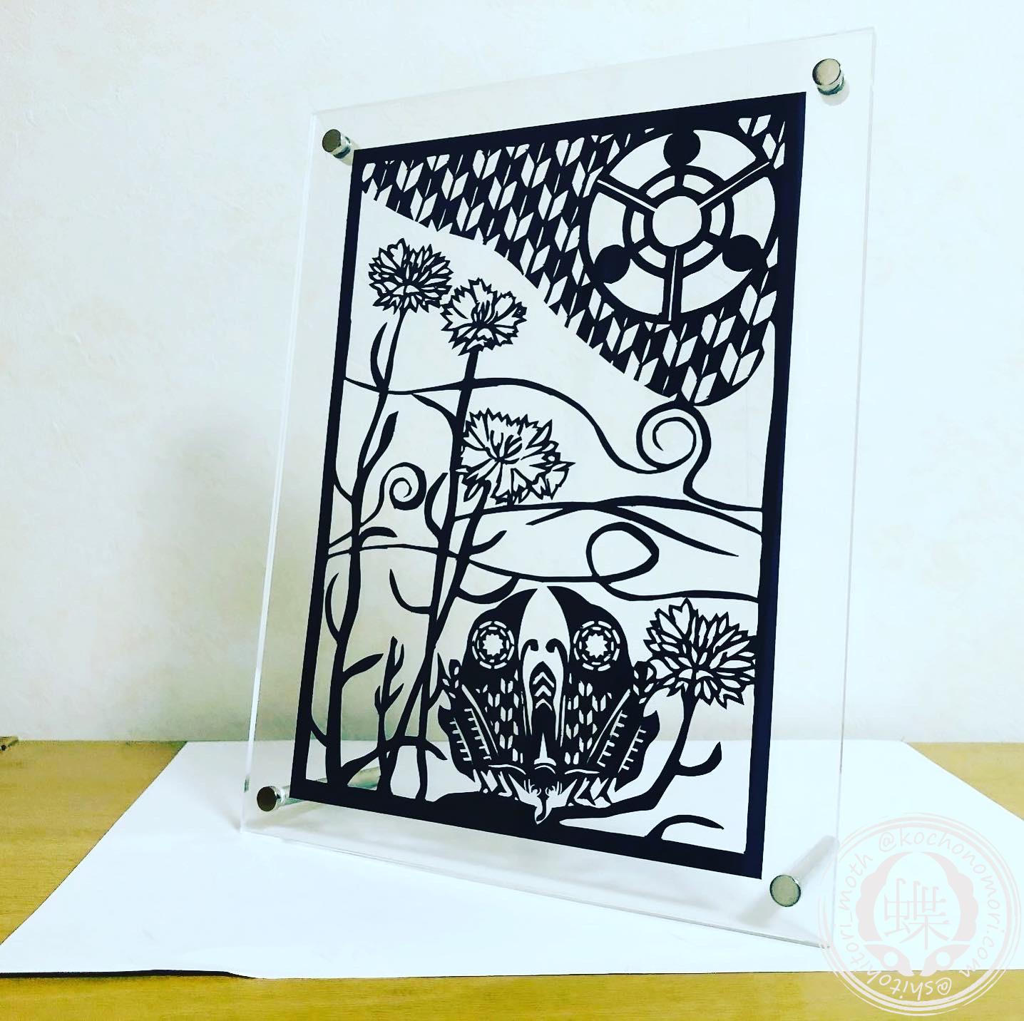 創作和文様【陰渡辺扇矢絣】を背景として構成した切り絵作品です。